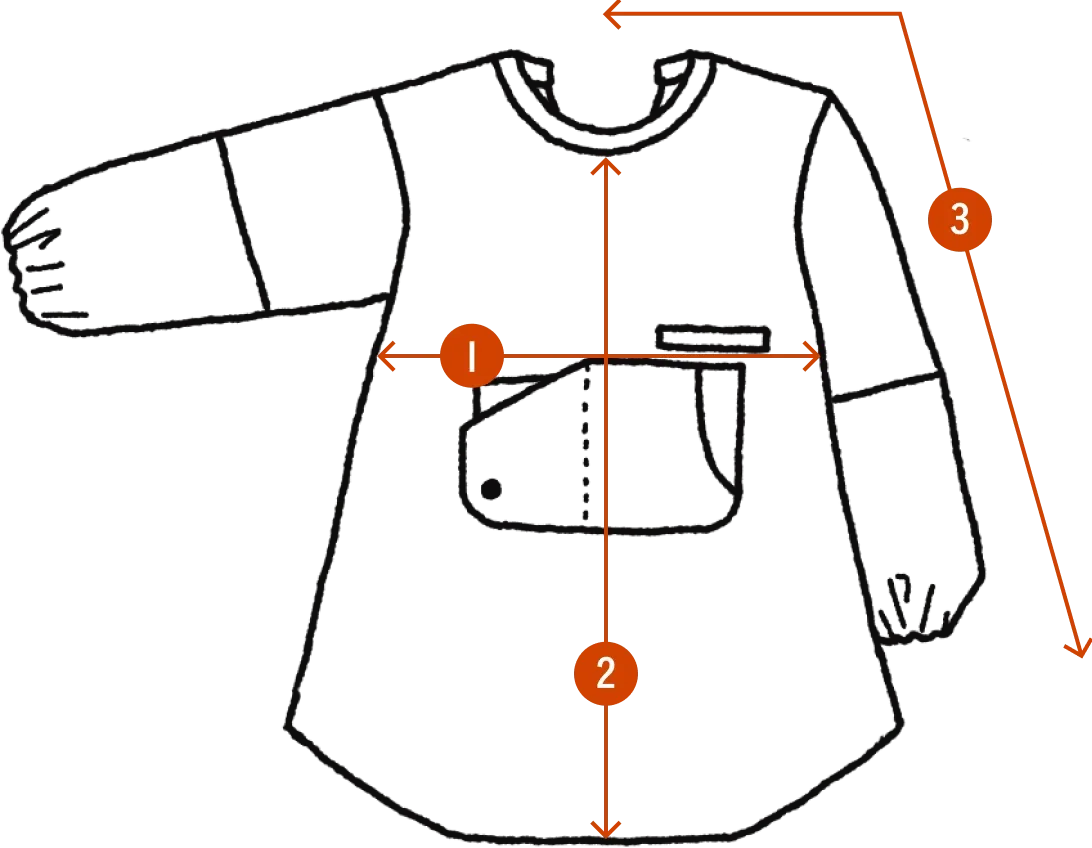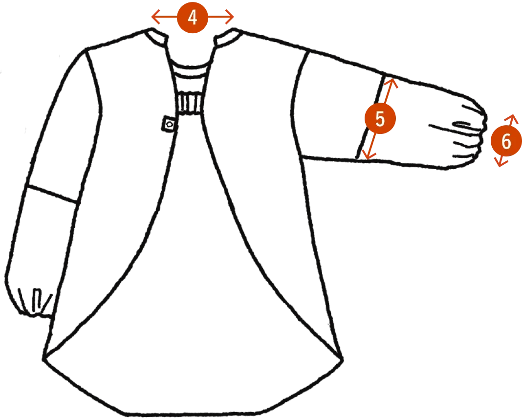 ①身幅:60公分 ②身長:75公分 ③裄丈:84公分 ④領圍:38.5公分 ⑤袖幅(防水布料部分):26公分 ⑥袖口周長:約20公分 |